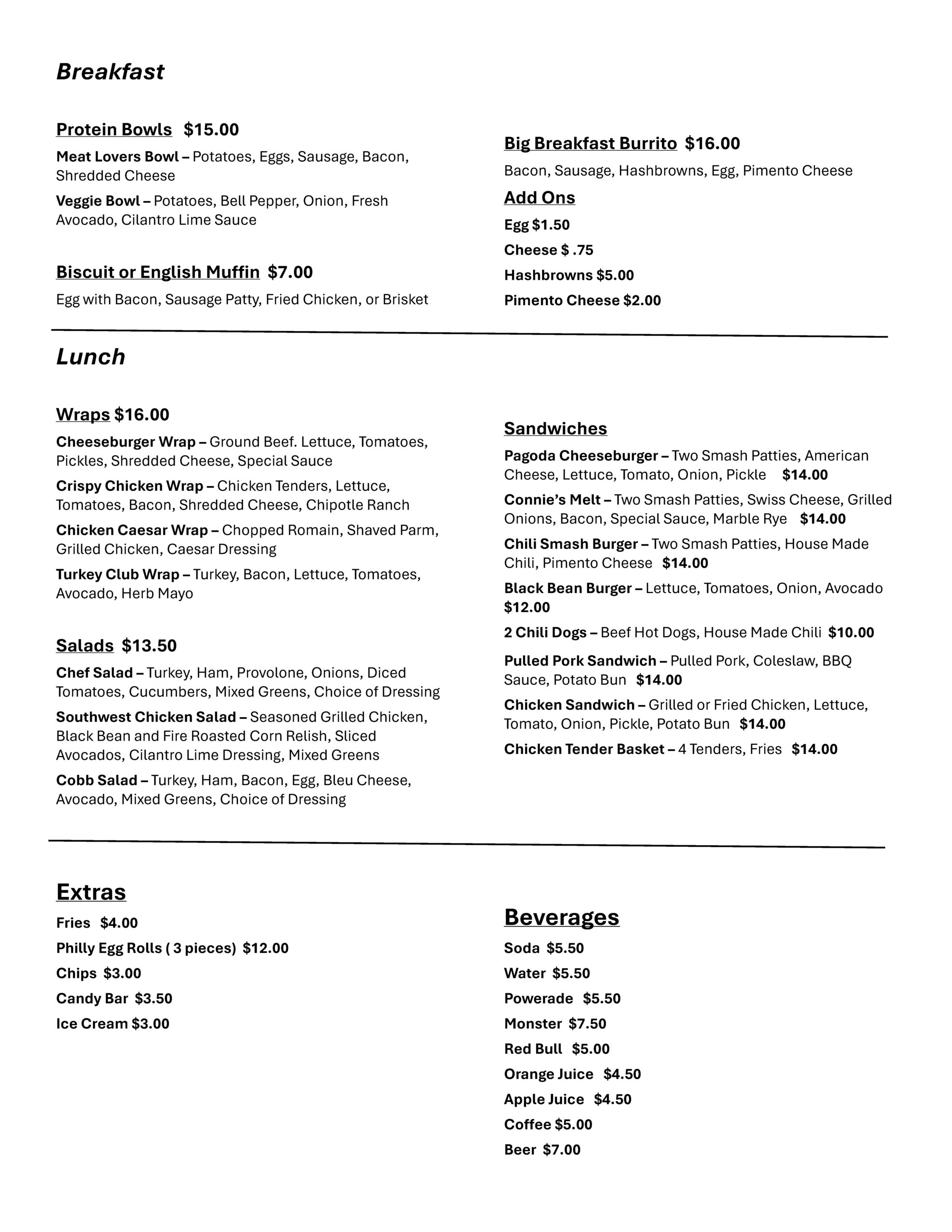 Please note that menu selections and pricing are subject to seasonal availability and may vary. The offerings listed are intended as a representative sample.